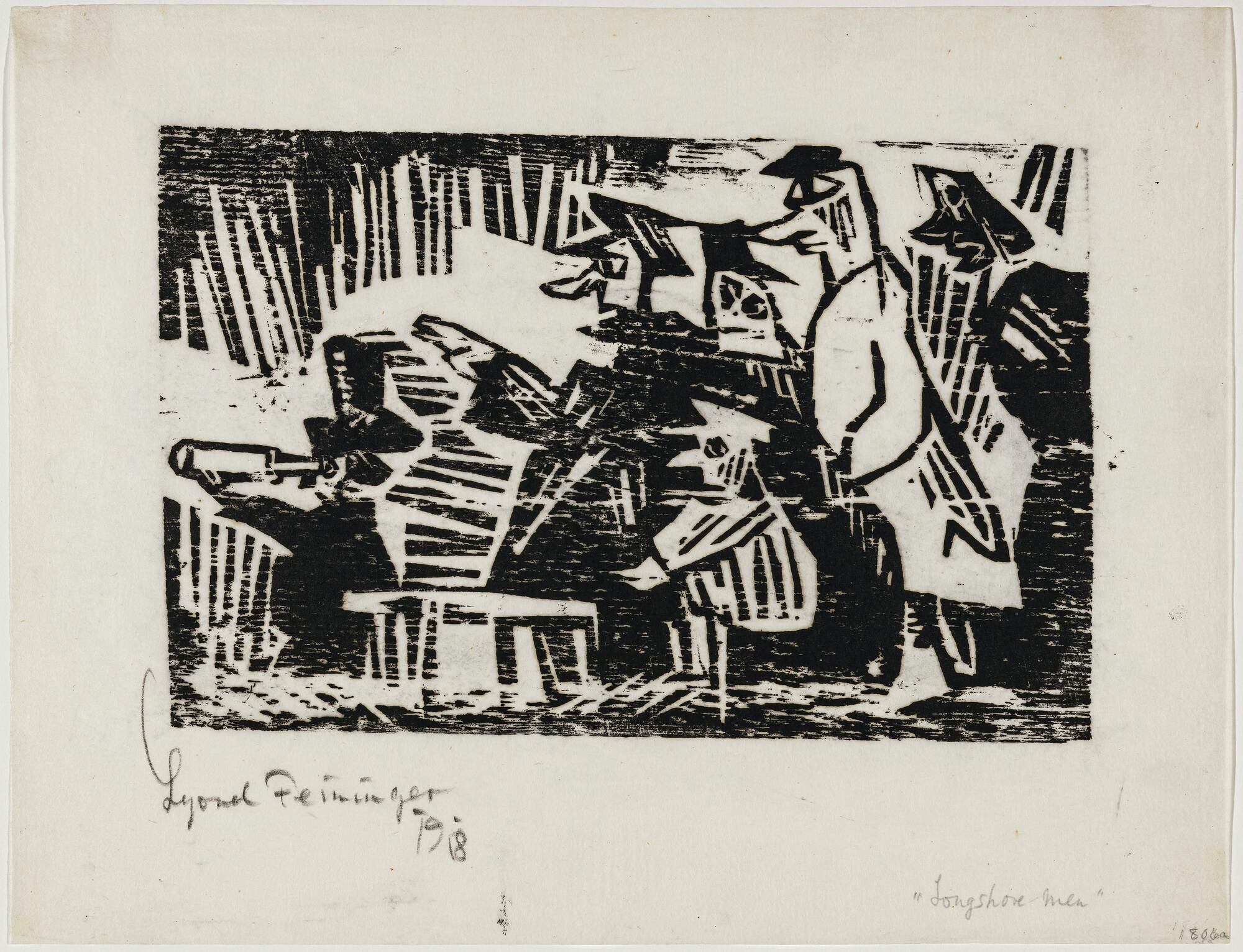 In dem Blatt, daß vom Künstler neben 'Longshore men' (Bezeichnung) auch 'Old shell backs' oder 'Waterside characters' genannt wird, sehen wir sechs Hafenarbeiter, die wohl nach einem Frachtdampfer Ausschau halten. Feininger zeigt hier seine typische Bildsprache, die Erlebtes, Phantasie und Skurilles auf humorvolle und verspielte Weise vereint. Die überlangen, spitzen Nasen und karikierten Gesichter der Seemänner verraten Feiningers Ursprung als Comiczeichner. Dazu kommt die symbolische Aufladung seiner Motive, vertreten durch den Arbeiter, der durch ein Fernrohr blickt, ein Gegenstand, der metaphorisch für Selbstreflexion und Weitsicht steht. Im Jahr 1918 entwirft Feininger eine ähnliche Figurenkonstellation, „Old shellbacks“ („Seebären“), aus der ein spiegelverkehrter Druck 1919 ("Alte Seebären") als Pendant und Variante unseres Motivs hervorgeht.