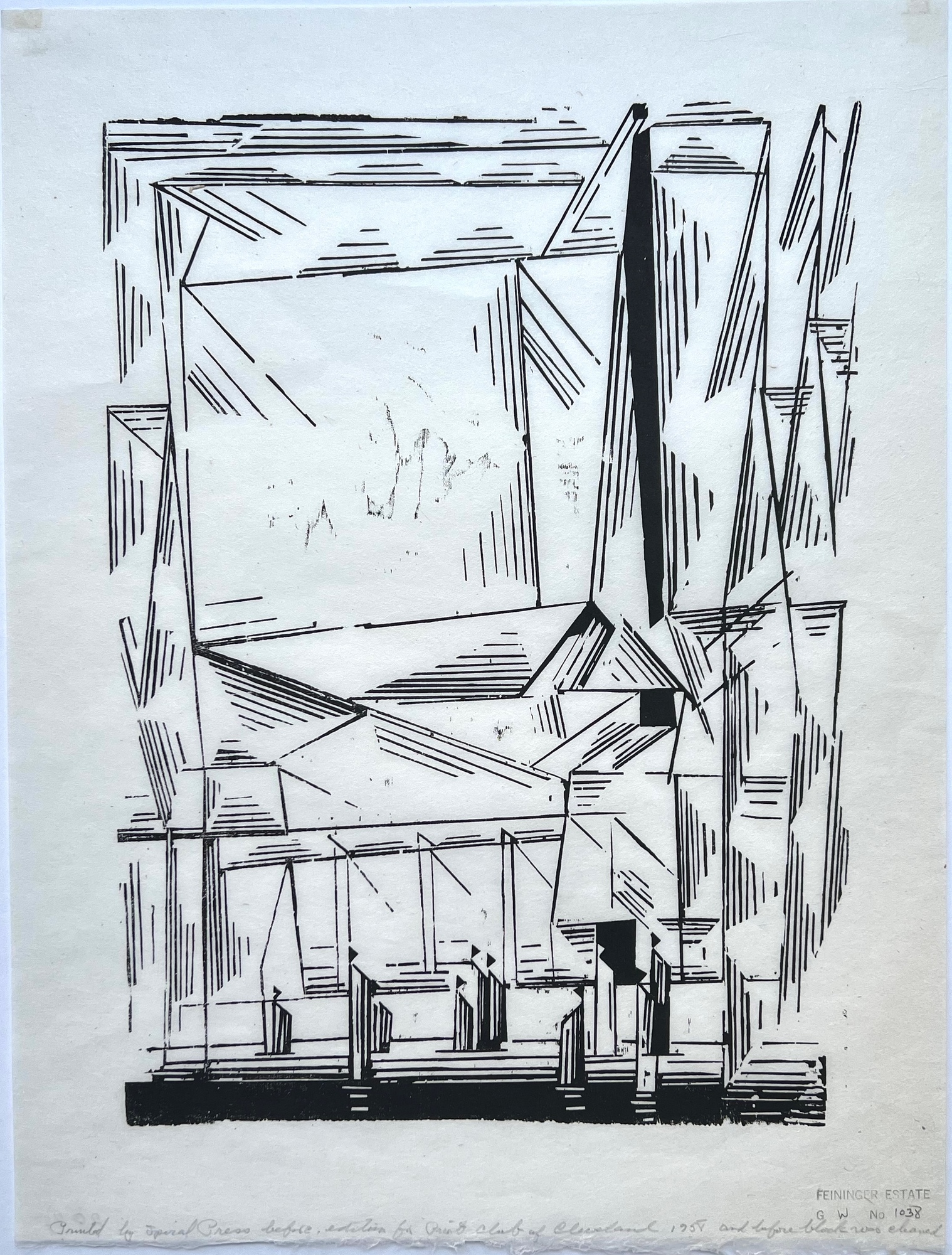 Im Mai 1958 druckt die Spiral Press (New York) für den Print Club of Cleveland einen Nachdruck in einer Auflage von 300 Exemplaren. Unser Blatt ist jedoch etwas Besonderes, da er (wie in der Bezeichnung recto angegeben) vor Reinigung des Holzstocks und dem Auflagendruck entstanden ist. Die Druckqualität dieses Exemplars ist daher eher mit der frühen Auflage zu Lebzeiten Feiningers vergleichbar, was nicht zuletzt an den noch sichtbaren, lebendigen Spuren des Holzstocks und mitdruckenden Strukturen etwa im Bereich des mittleren Quadrats sichtbar wird (bei den Nachdrucken sind diese Spuren verschwunden). Zudem stammt unsere Graphik aus dem Besitz Agi Müller-Geisslers, einer Großnichte Erich Heckels, die ein besonderes Gespür für herausragende Werke der Moderne besaß.