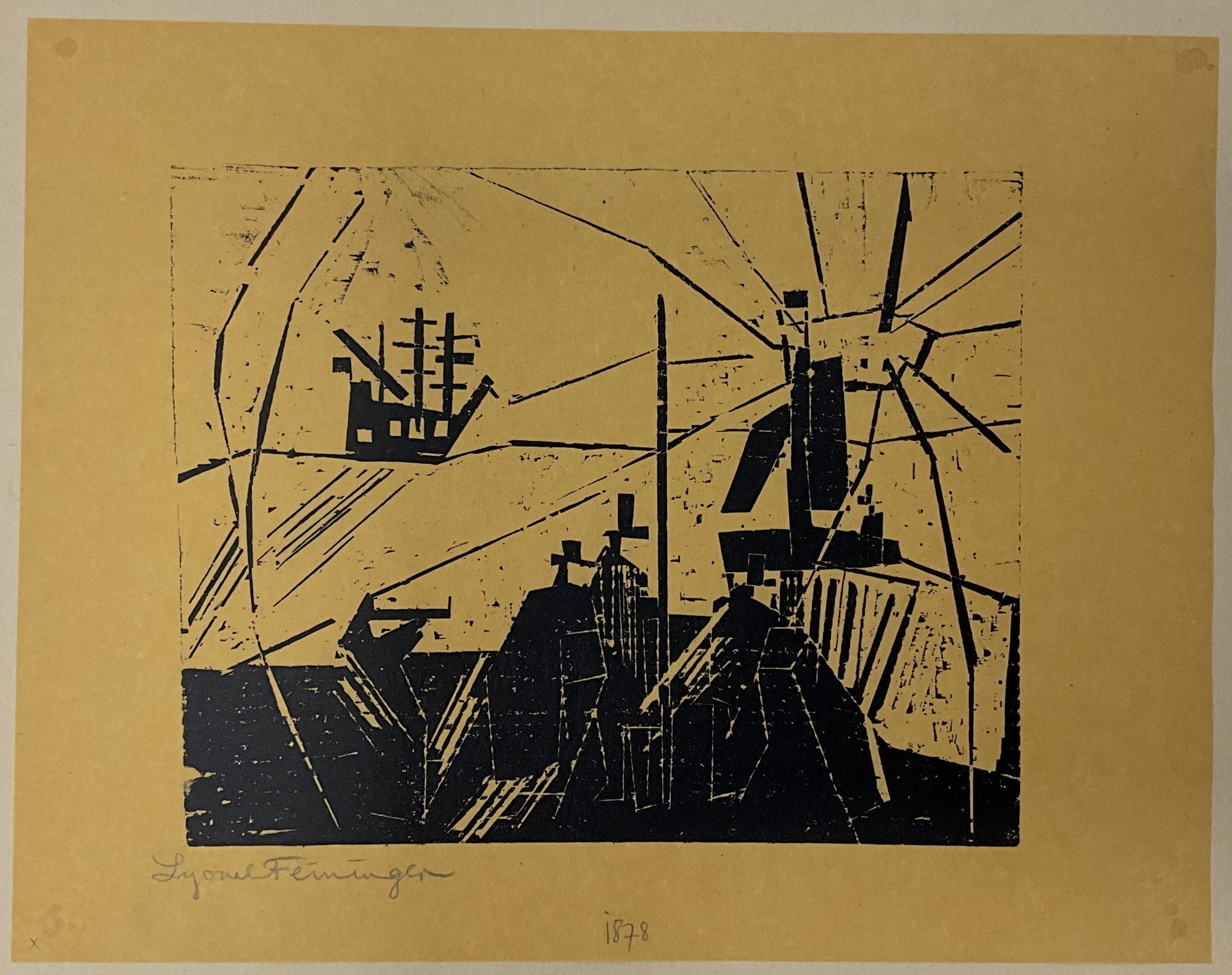 Im WVZ auch "Schiff an der Schleuse" oder "Leuchtturm und Schiff" genannt, zählt dieses Blatt zu einem von insgesamt 44 Holzschnitten des Jahres 1920. Unser prachtvoller Druck ist eine Hommage an die Ostsee und Resultat der Vorliebe Feiningers für Segelschiffe mit Figuren. Ruhig und majestätisch liegt ein Schiffskörper im Kanal, vermutlich ist es die Spree. Zwei Angler befinden sich an Bord, einer versucht sein Glück mit der Angel an Land. Feininger löst die Komposition in seine einzigartige kristalline und blockhafte Gestaltungsweise auf, die besonders gut im Holzschnitt zum Tragen kommt: die Masten, Segel, die Angel, das Wasser, der Himmel sowie die Figuren sind auf das Elementarste, auf geometrische Formen und Schwarz-Weiß-Kontraste reduziert, von weißen Kuben und Streifen "durchbrochen". Linien, Motive und Flächen bilden ein dynamisches Kräftespiel und kaum mehr erkennbares Raumgefüge. Verstärkt wird diese Konzeption durch den Kontrast des kräftigen Drucks von tiefem, sattem Schwarz und dem hellen Papier der unbedruckten lichtdurchfluteten Partien.