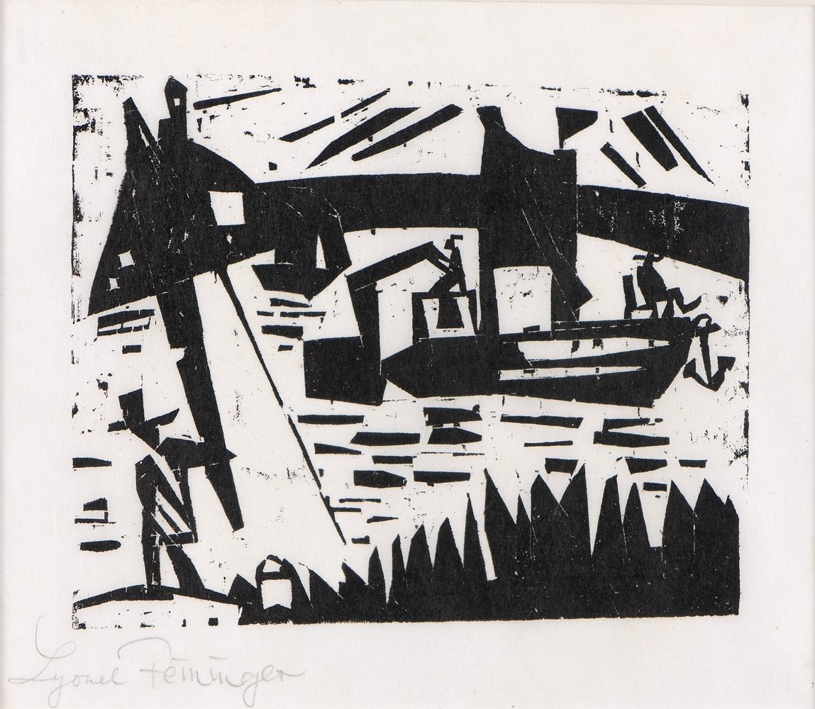 Im WVZ auch "Schiff an der Schleuse" oder "Leuchtturm und Schiff" genannt, zählt dieses Blatt zu einem von insgesamt 44 Holzschnitten des Jahres 1920. Unser prachtvoller Druck ist eine Hommage an die Ostsee und Resultat der Vorliebe Feiningers für Segelschiffe mit Figuren. Ruhig und majestätisch liegt ein Schiffskörper im Kanal, vermutlich ist es die Spree. Zwei Angler befinden sich an Bord, einer versucht sein Glück mit der Angel an Land. Feininger löst die Komposition in seine einzigartige kristalline und blockhafte Gestaltungsweise auf, die besonders gut im Holzschnitt zum Tragen kommt: die Masten, Segel, die Angel, das Wasser, der Himmel sowie die Figuren sind auf das Elementarste, auf geometrische Formen und Schwarz-Weiß-Kontraste reduziert, von weißen Kuben und Streifen "durchbrochen". Linien, Motive und Flächen bilden ein dynamisches Kräftespiel und kaum mehr erkennbares Raumgefüge. Verstärkt wird diese Konzeption durch den Kontrast des kräftigen Drucks von tiefem, sattem Schwarz und dem hellen Papier der unbedruckten lichtdurchfluteten Partien.