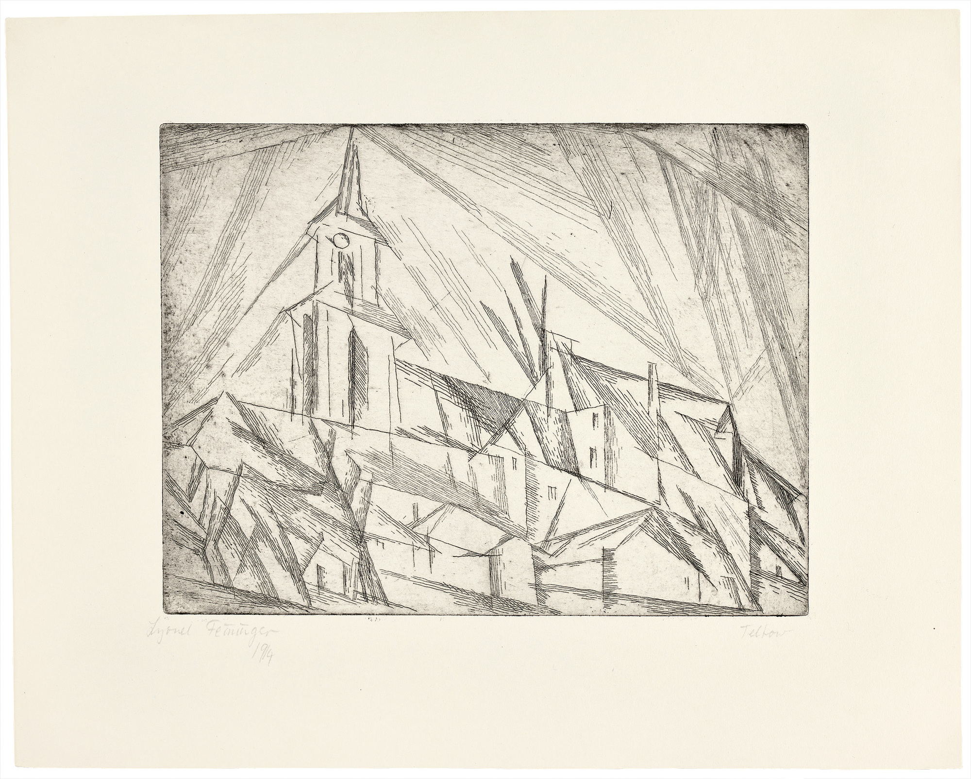 Dabei stellt die Technik der Radierung den Künstler vor besondere Herausforderungen. Mit „Teltow, 1“ gelingt ihm jedoch ein Meisterstück, eine filigrane, nuancenreiche Radierung voller Transparenz. Die Realität der Kirche im südlich von Berlin gelegenen Teltow wird zugunsten des expressiven Ausdrucks verzerrt. Wie neuartig und bedeutsam Feiningers Arbeit ist, verdeutlicht der Künstler selbst: „I have finished the etching of Teltow church, have washed it off and it looks promising. I think I have started on a new line of works with this one, no amalgamation, pure graphic without picturesque addition ...“.