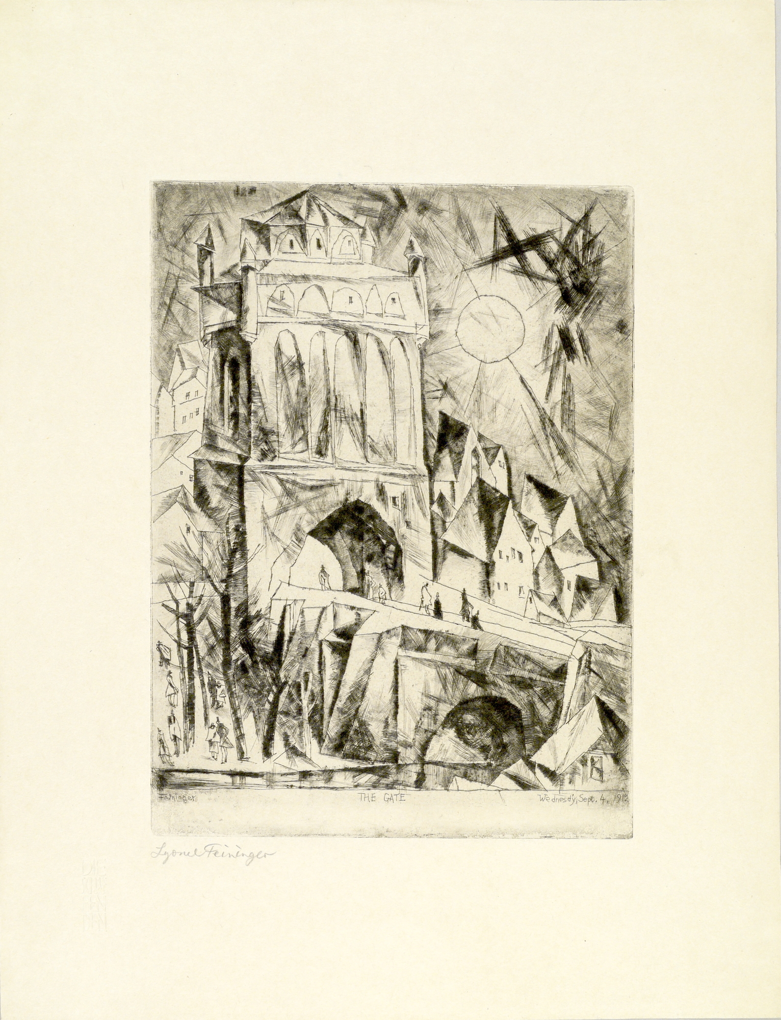 Ein charakteristisches Beispiel für seine frühen Radierungen bietet Lyonel Feininger in "The Gate". Das imposante und vom Künstler typischerweise monumentalisierte Architekturmotiv, mit dem er u.a. eine neue "Weltsicht" und Perspektive aufzeigen will, basiert auf den Feininger'schen Streifzügen durch Mecklenburg-Vorpommern und zeigt das "Rostocker Tor" in Ribnitz-Damgarten. Bereits 1905 reist Feininger erstmals dorthin und entdeckt diesen einzig erhaltenen Torturm der mittelalterlichen Stadtbefestigung. Dieses Bauwerk fasziniert den Künstler nachhaltig: nach einer Reihe von Naturnotizen entsteht 1911 eine Federzeichnung, die das Motiv unseres Blattes bereits exakt wiedergibt. Kaum in sein Atelier zurückgekehrt, beginnt Feininger, die Darstellung in die Radierung umzusetzen. „Das Tor“ stellt dabei einen technischen Höhepunkt dar: erstmals gelingt es ihm, mit rein graphischen Mitteln eine transparente, raumgreifende Wirkung zu erzielen, und so dem ihm vorschwebenden Architektur-Ideal näher zu kommen. Die dunklen Schattierungen der differenzierten wie markanten Radierstriche erzeugen dabei eine dramatische Bildwirkung.
