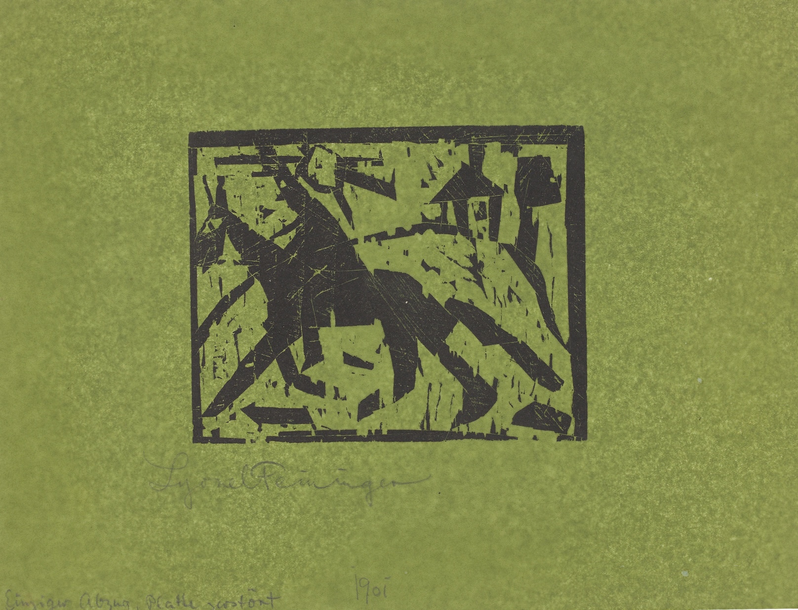 Unser 1919 in Holz geschnittenes Unikat zeigt die typischen Elemente der modernen, kubistischen Feininger'schen Graphik. Von aller Komplexität befreit und durchaus leicht verspielt, hebt sich ein schwarzer Reiter auf einem Pferd silhouettenhaft vor dem Hintergrund aus Sonne, Hügel und Haus ab, der durch kleine zarte, schwarz-druckende Holzstege einen Kontrapunkt setzt. Feininger, 1919 im Gründungsjahr als Meister am Bauhaus mit dem „Bauhausmanifest“ beschäftigt, scheint einmal mehr mit diesem Medium zu experimentieren und seiner Gestaltungslust wie Phantasie freien Lauf zu lassen.