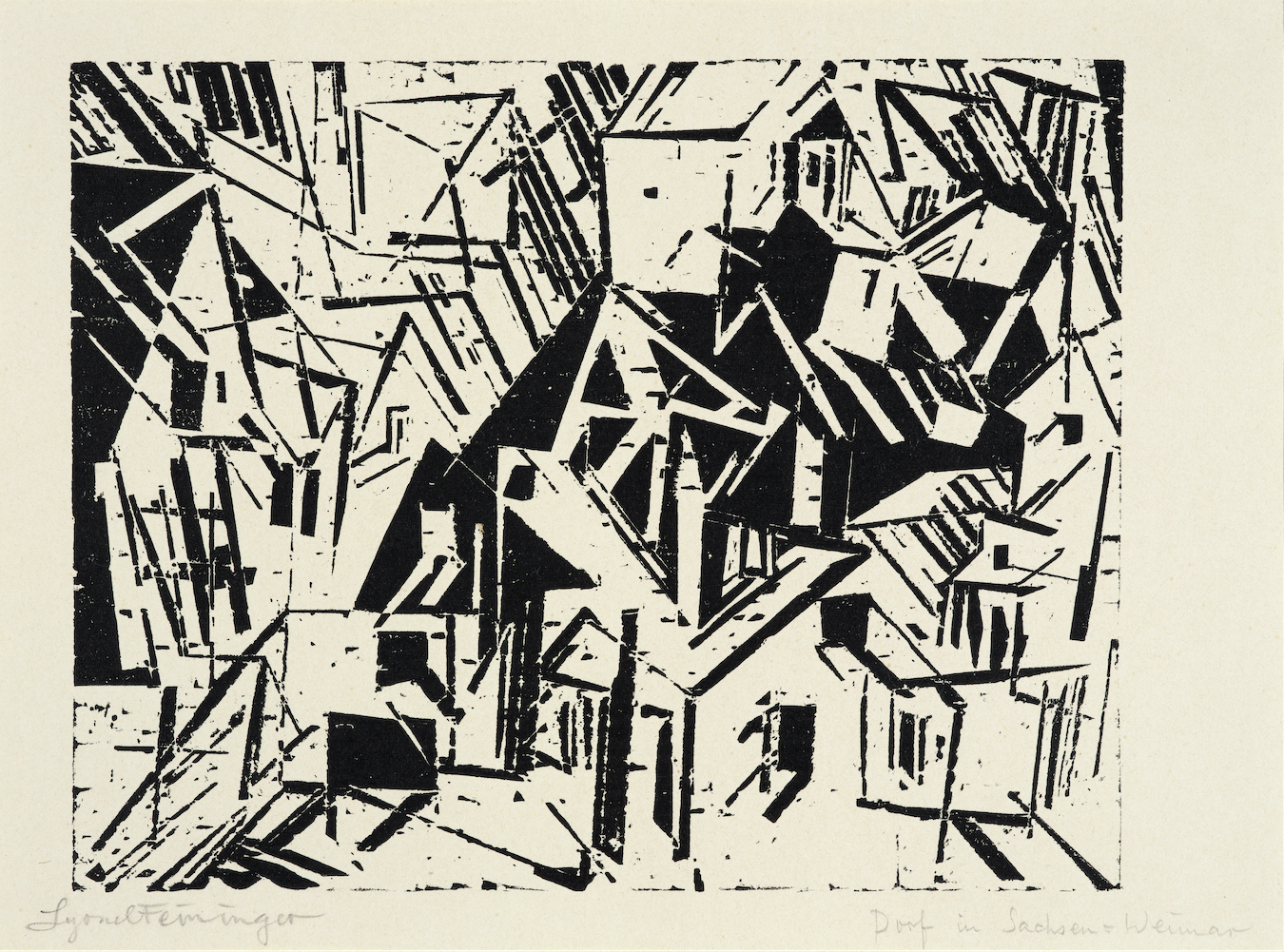 „Die Dörfer, wohl über Hundert, in der Umgebung sind prachtvoll! Die Architektur (sie wissen ja, wie ich von der ausgehe!) ist mir gerade recht, so anregend, zum Teil so ungemein monumental! [...]“, schreibt Feininger. In diesem Sinne ist der Künstler während der späten 1910er Jahre in Thüringen und im Weimarer Umland unterwegs und wohl auch von einem Dorf fasziniert, dessen Häuser und Architektur er festhält. Der Titel unseres Drucks, „Sachsen-Weimar“ (bei Prasse als "Sächsisches Dorf" oder "Dorf in Sachsen" verzeichnet), stammt von Feininger selbst und bezieht sich wohl auf die alte Namensgebung des heutigen Bundeslandes Thüringen als "Großherzogtum Sachsen-Weimar-Eisenach" (damals einer der größten Staaten des Deutschen Reiches).